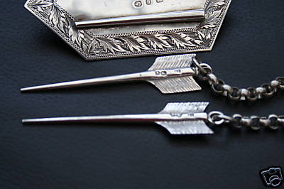 Birmingham hallmarks for 1879. Silver boss, chains, arrow