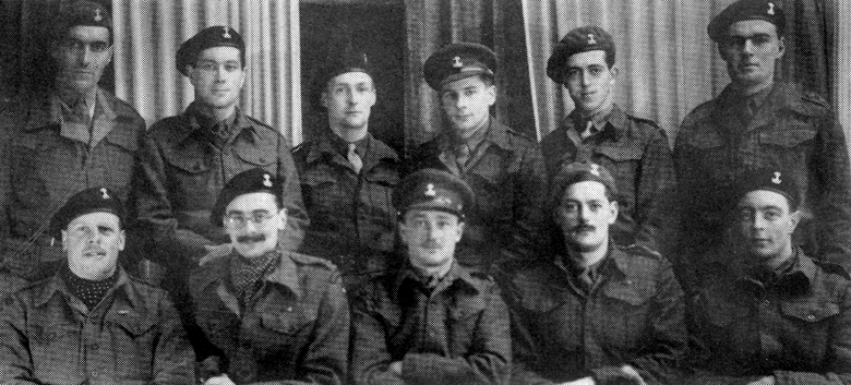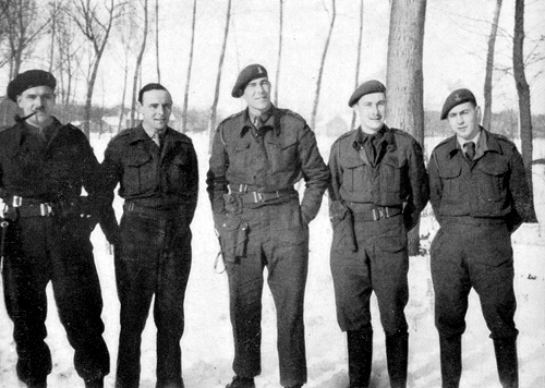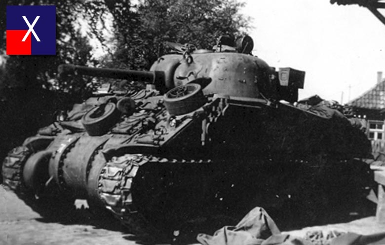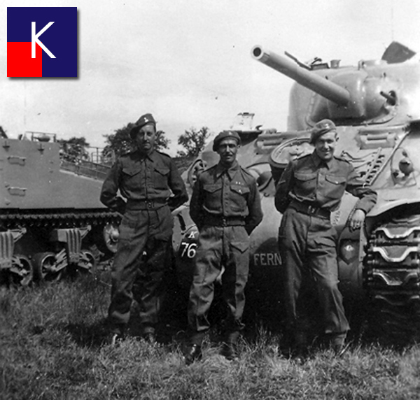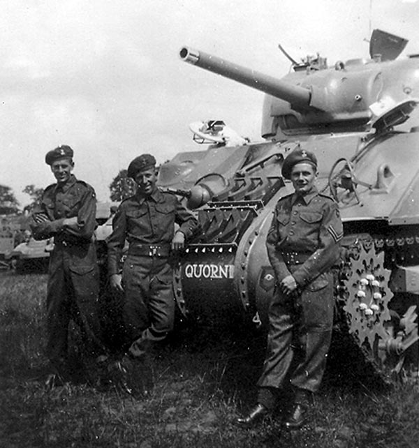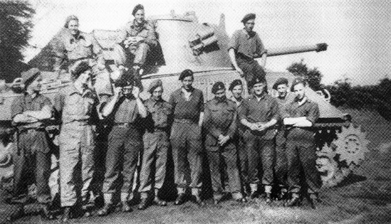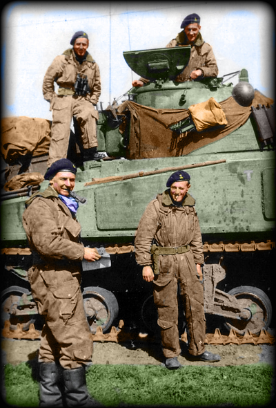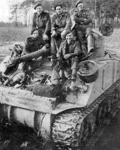 Men of RHQ standing next to a 153 OP Sherman in its GOC